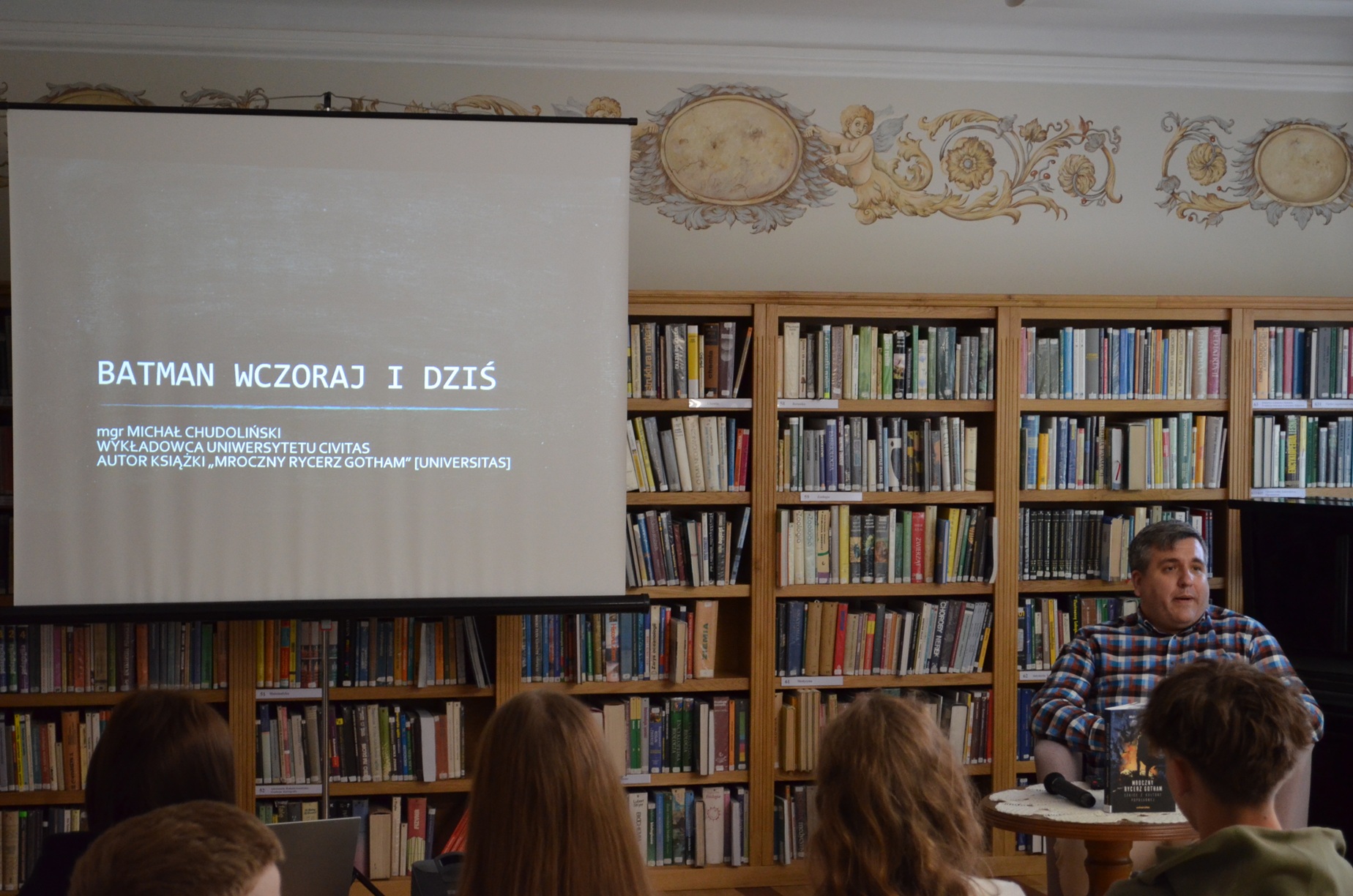 W Pułtuskiej Bibliotece Publicznej im. Joachima Lelewela 14 maja br. odbyło się ciekawe spotkanie z krytykiem komiksowym i filmowym, autorem książki „Mroczny Rycerz Gotham. Szkice z kultury popularnej” – Michałem Chudolińskim. Podczas dyskusji autor przedstawił historię komiksów o Batmanie, różnorodne sposoby przedstawienia bohatera na przestrzeni dekad oraz jego znaczenie w historii popkultury, dzięki czemu odczarował przed uczestnikami spotkania utwory o Mrocznym Rycerzu, ukazując ich różnorodność, artystyczną dojrzałość i szerokie możliwości interpretacji. Samorząd Gminy Pułtusk podczas wydarzenia reprezentował Zastępca Burmistrza Miasta Pułtusk Mateusz Miłoszewski.