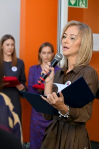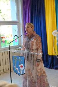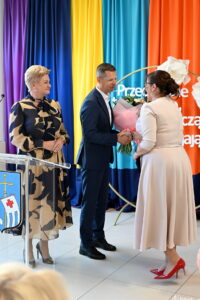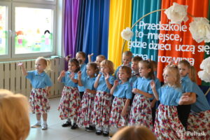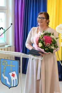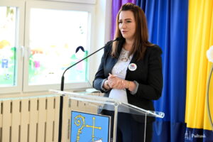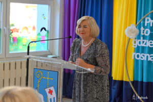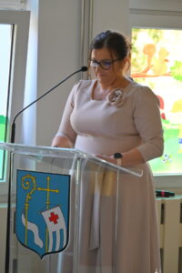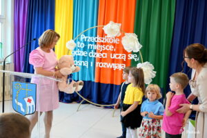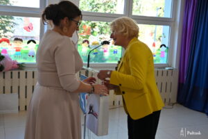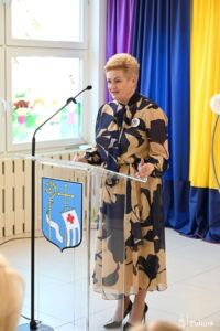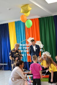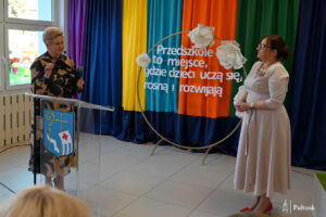 Nie zabrakło również części artystycznej – krótkiego programu przygotowanego przez przedszkolaków. Po występie przyszedł czas na gratulacje, życzenia i przekazanie upominków. W imieniu gospodarza uroczystości głos zabrała Katarzyna Przewłocka Dyrektor Przedszkola Miejskiego nr 5.