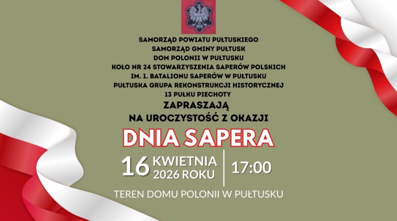 Samorząd Powiatu Pułtuskiego, Samorząd Gminy Pułtusk, Dom Polonii w Pułtusku, Koło nr 24 Stowarzyszenia Saperów Polskich im. 1. Batalionu Saperów w Pułtusku oraz Pułtuska Grupa Rekonstrukcji Historycznej 13 Pułku Piechoty zapraszają na uroczystość z okazji Dnia Sapera.