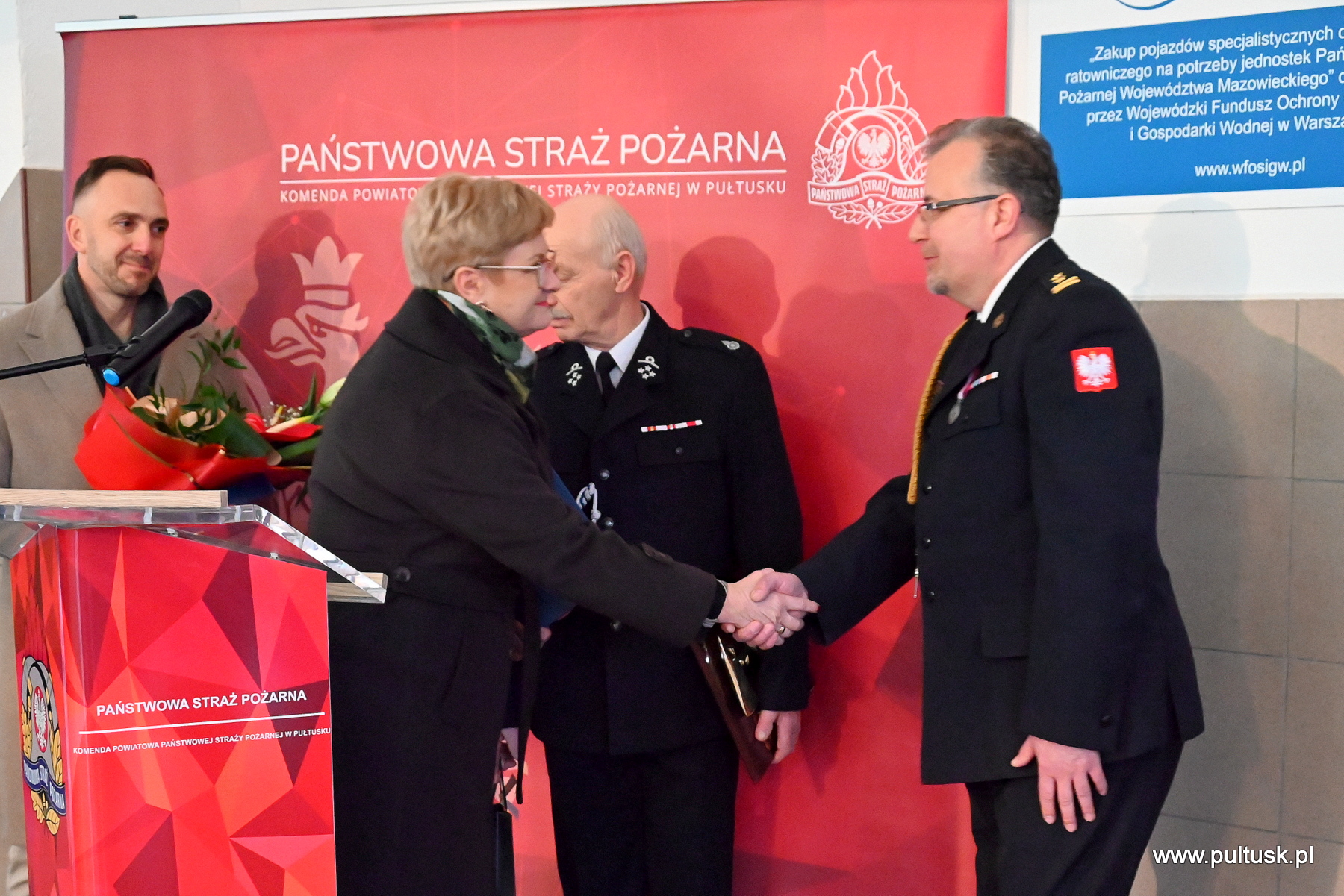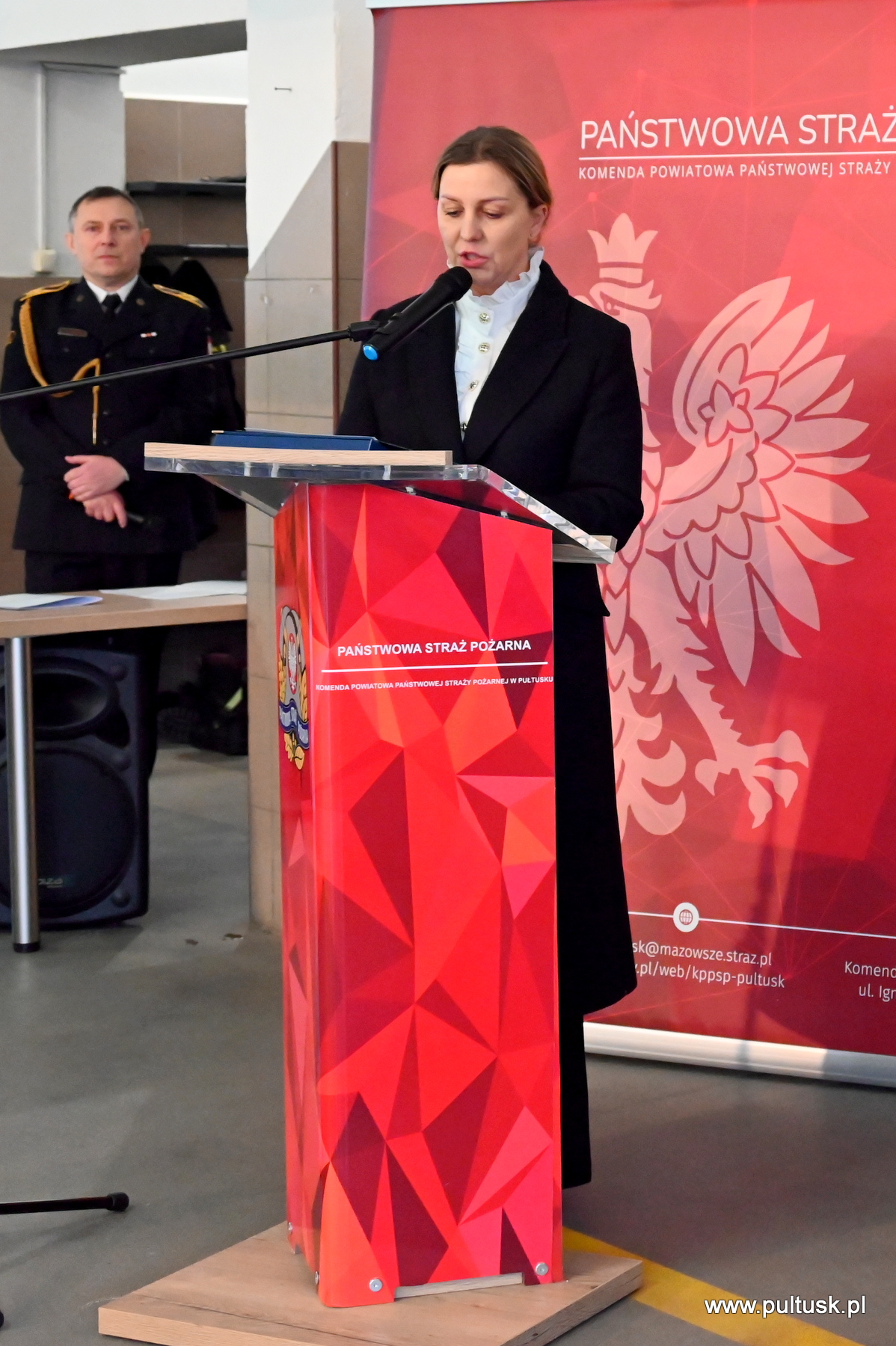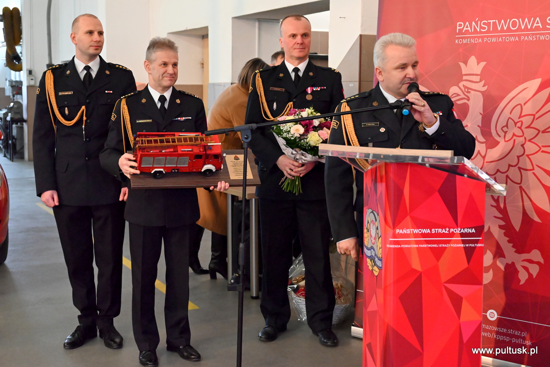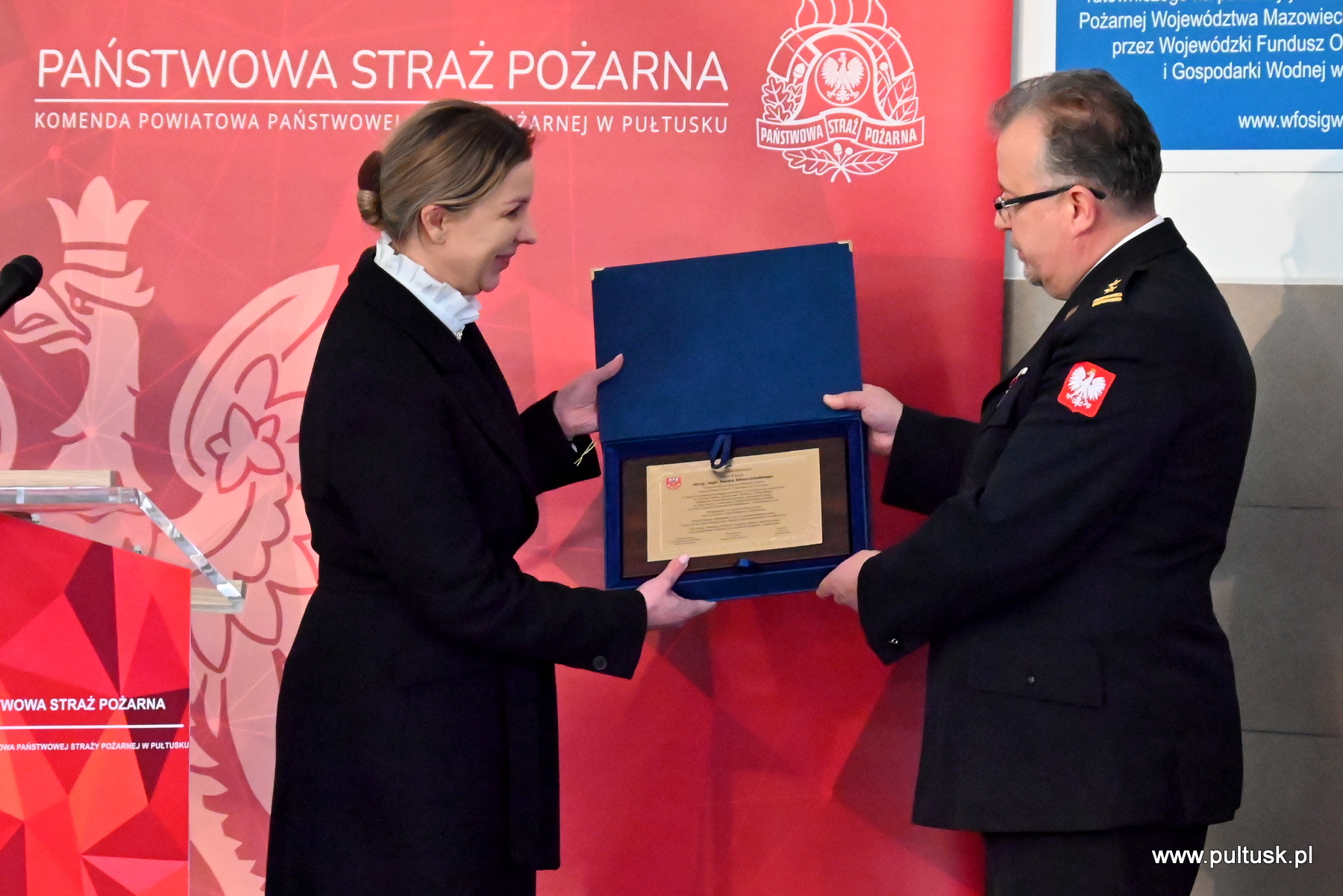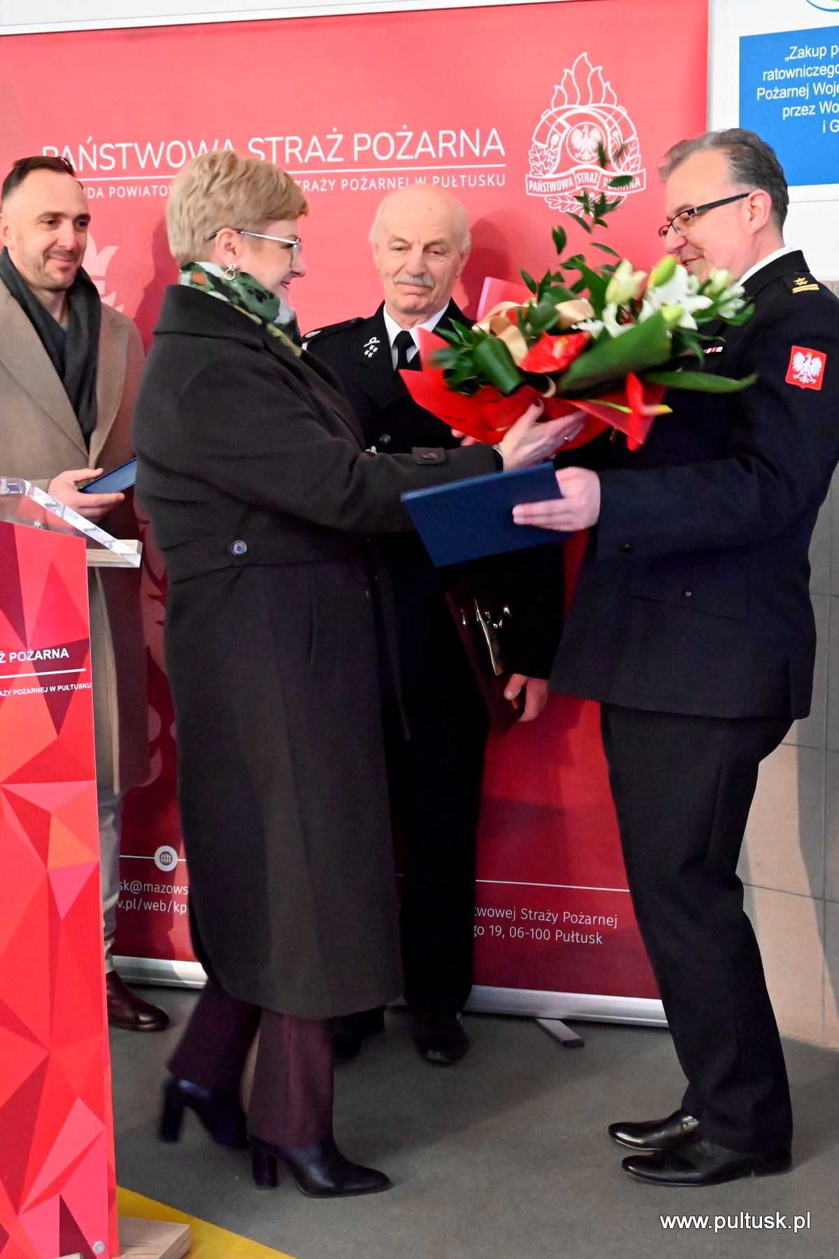 Burmistrz w imieniu Samorządu Gminy Pułtusk wyraziła podziękowanie i uznanie za niezwykłe zaangażowanie i profesjonalizm oraz za współpracę i wspieranie działań podejmowanych na rzecz bezpieczeństwa mieszkańców naszej gminy. Burmistrz wręczyła przechodzącemu na emeryturę Zastępcy Komendanta bukiet kwiatów oraz okolicznościowy dyplom i list.