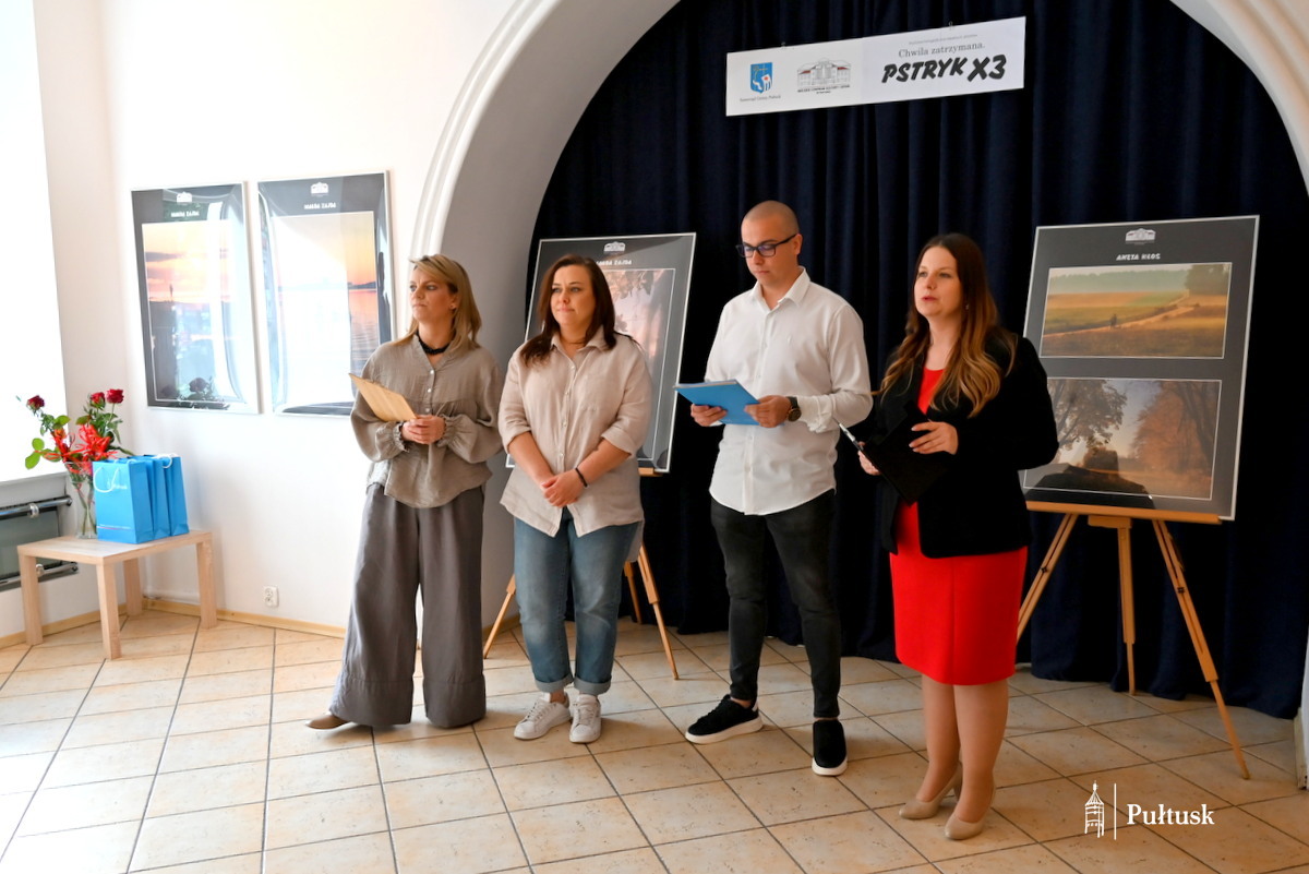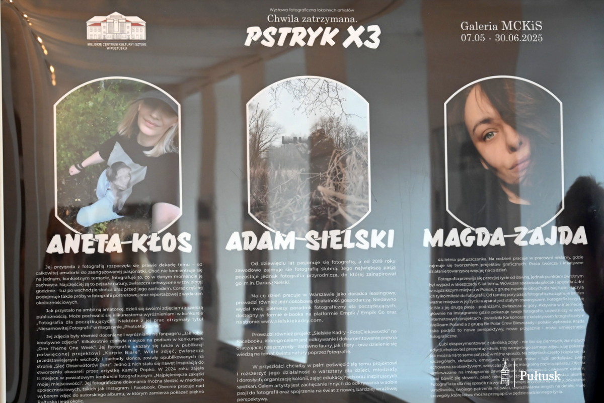 W Galerii Miejskiego Centrum Kultury i Sztuki w Pułtusku, 7 maja 2025 r. odbył się wernisaż wystawy fotograficznej „Chwila zatrzymana. PSTRYK x3”. Ekspozycja cieszyła się dużym zainteresowaniem pułtuszczan. Otwarcie wystawy poprowadziła Dyrektor MCKiS Ewelina Wielechowska opowiadając o fotografii jako sztuce zatrzymującej czas i chwile, które umykają naszej codziennej uwadze: piękno miejsc i ludzi oraz emocje. Następnie o sobie i swoich pasjach opowiedzieli artyści – Aneta Kłos, Adam Sielski i Magda Zajda. Samorząd Gminy Pułtusk podczas wydarzenia reprezentowali: Burmistrz Miasta Pułtusk Beata Jóźwiak oraz Zastępca Burmistrza Miasta Pułtusk Mateusz Miłoszewski.