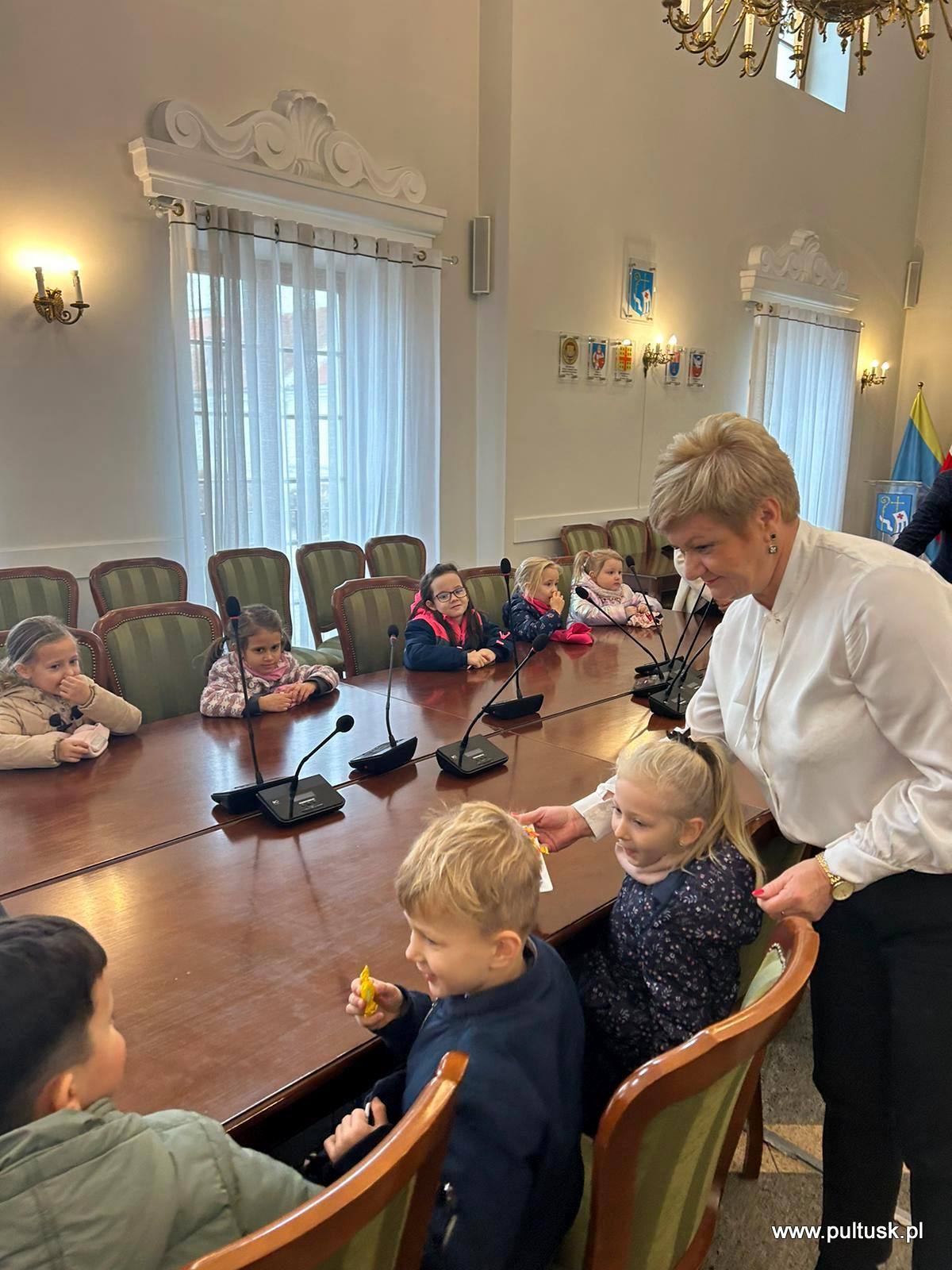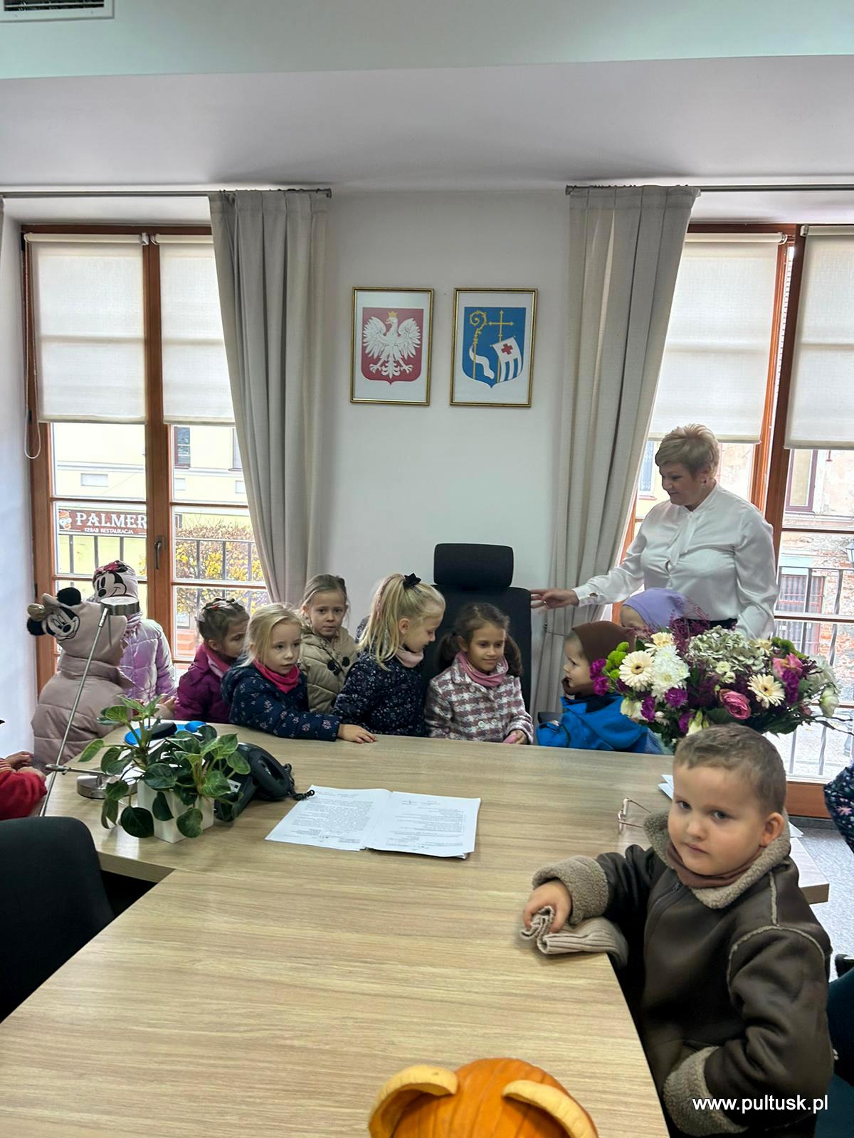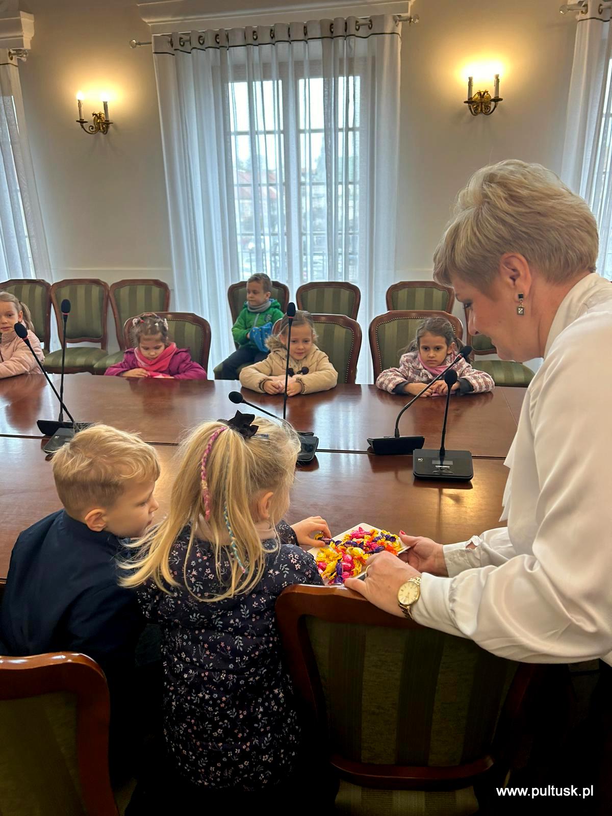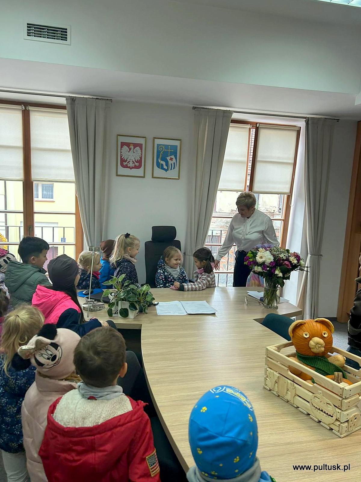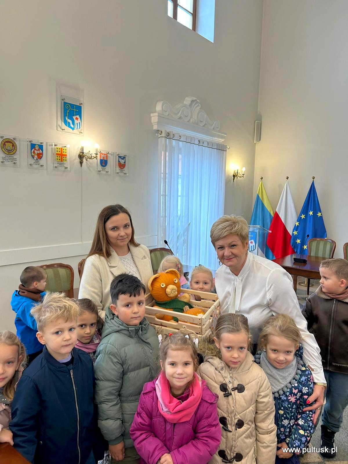 W czwartek, 31 października br., przedszkolaki z Przedszkola Miejskiego Nr 4 z Oddziałami Integracyjnymi w Pułtusku z okazji Święta Dyni odwiedzili w Urzędzie Miejskim Burmistrza Miasta Pułtusk Beatę Jóźwiak i Zastępcę Burmistrza Mateusza Miłoszewskiego, przekazując jesienne, dyniowe prezenty. To była bardzo miła niespodzianka. Dzieci miały okazję porozmawiać z Burmistrzem Miasta Pułtusk, zadać pytania, a także zobaczyć miejsce pracy. Spotkanie przebiegło w miłej i ciepłej atmosferze.