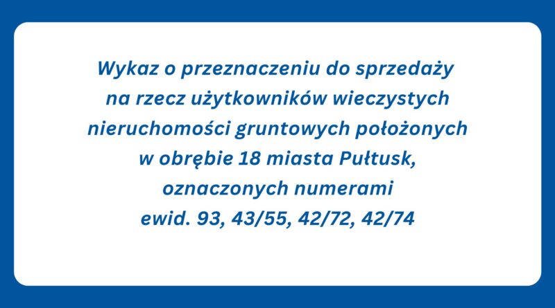 Burmistrz Miasta Pułtusk informuje, że przeznaczone zostały do sprzedaży na rzecz użytkowników wieczystych nieruchomości gruntowe stanowiące własność Gminy Pułtusk, położone w obrębie 18 miasta Pułtusk, oznaczone numerami ewidencyjnymi: