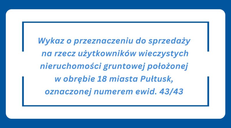 Burmistrz Miasta Pułtusk informuje, że przeznaczona została do sprzedaży na rzecz użytkowników wieczystych nieruchomość gruntowa stanowiąca własność Gminy Pułtusk, położona w obrębie 18 miasta Pułtusk, oznaczona numerem ewidencyjnym: