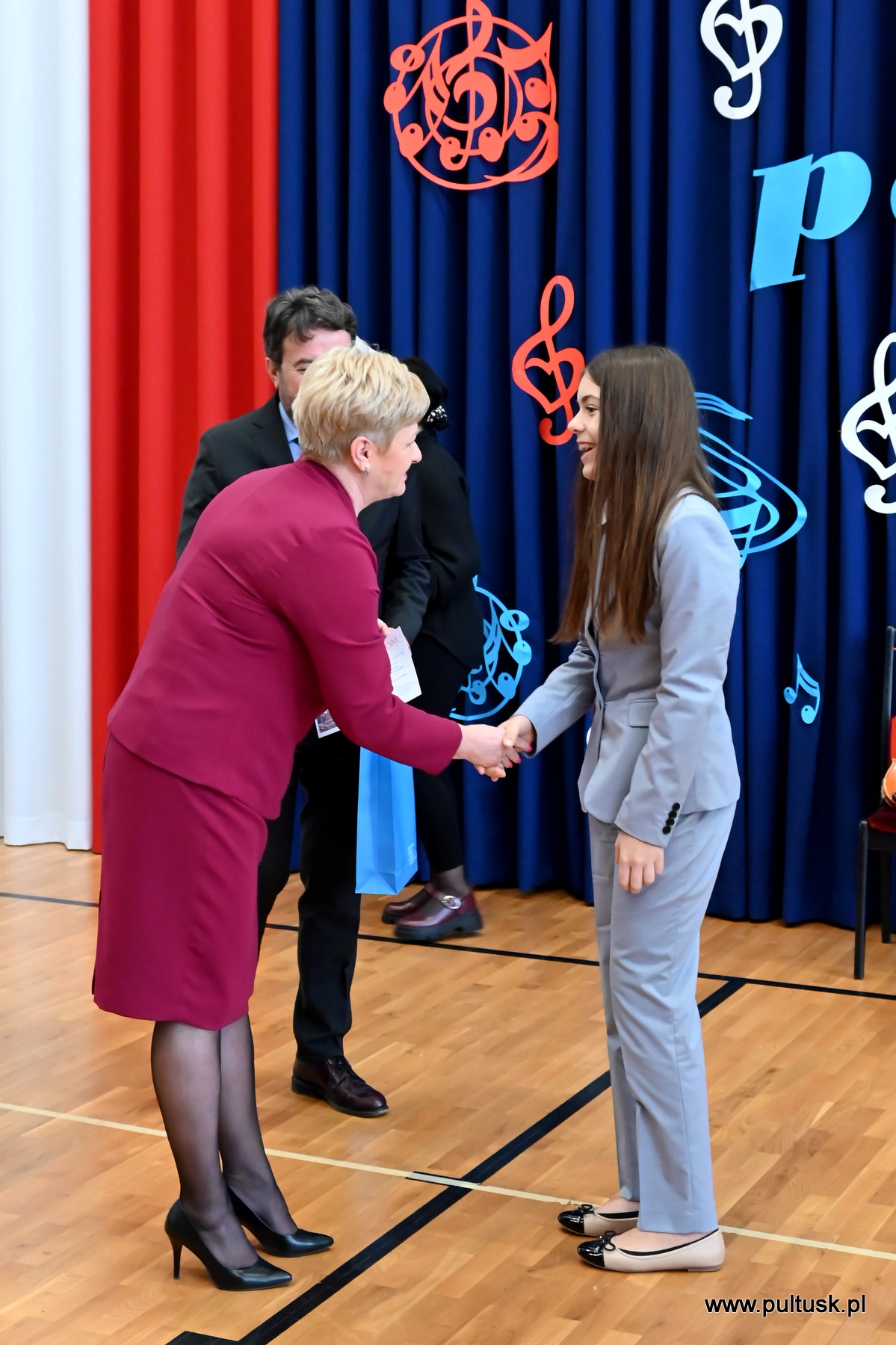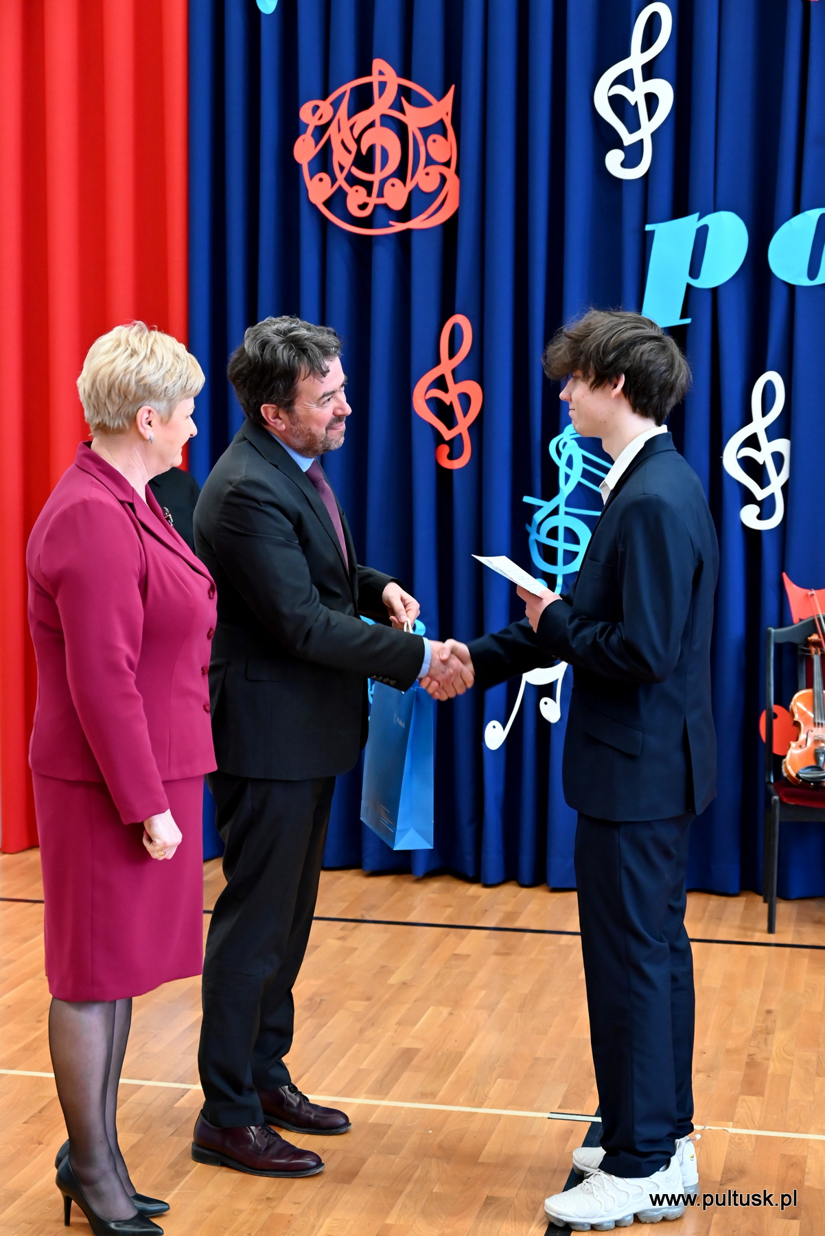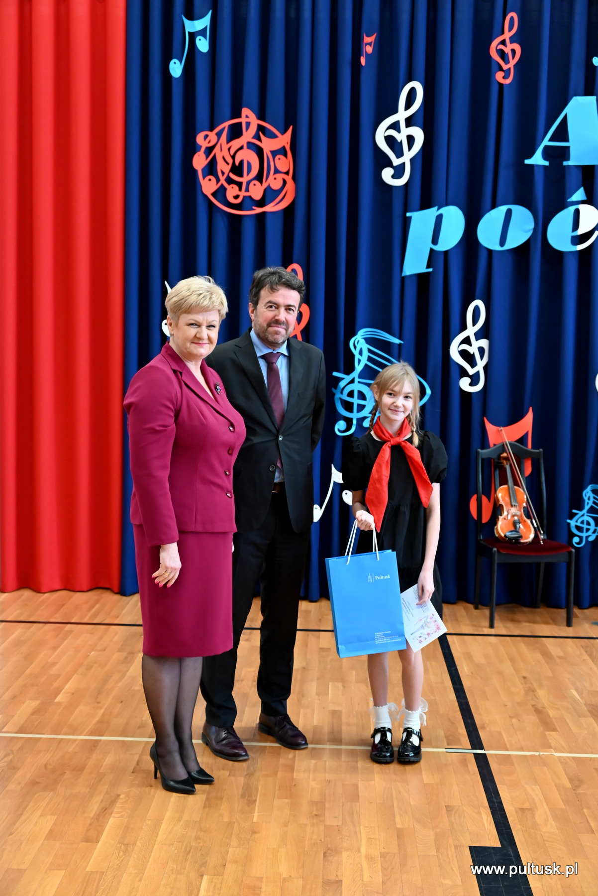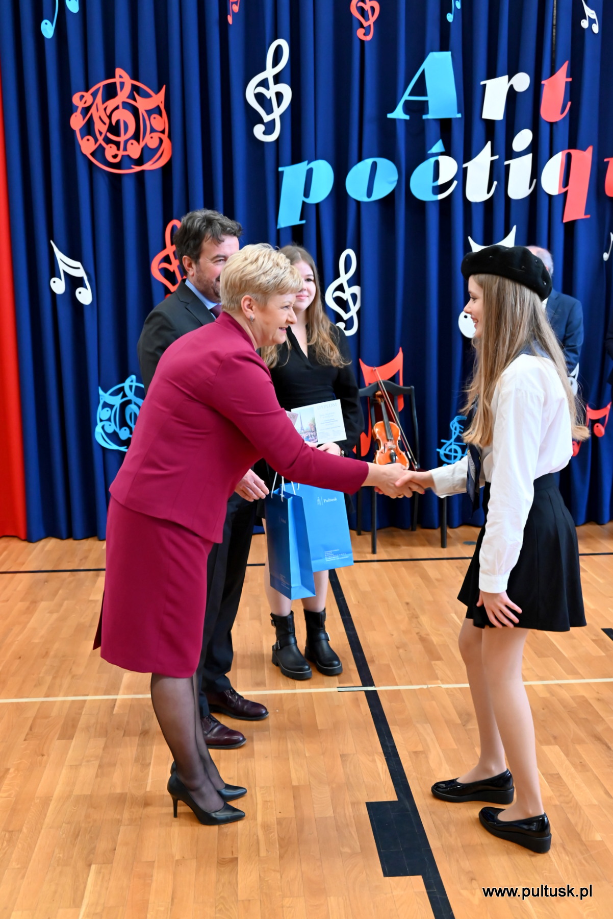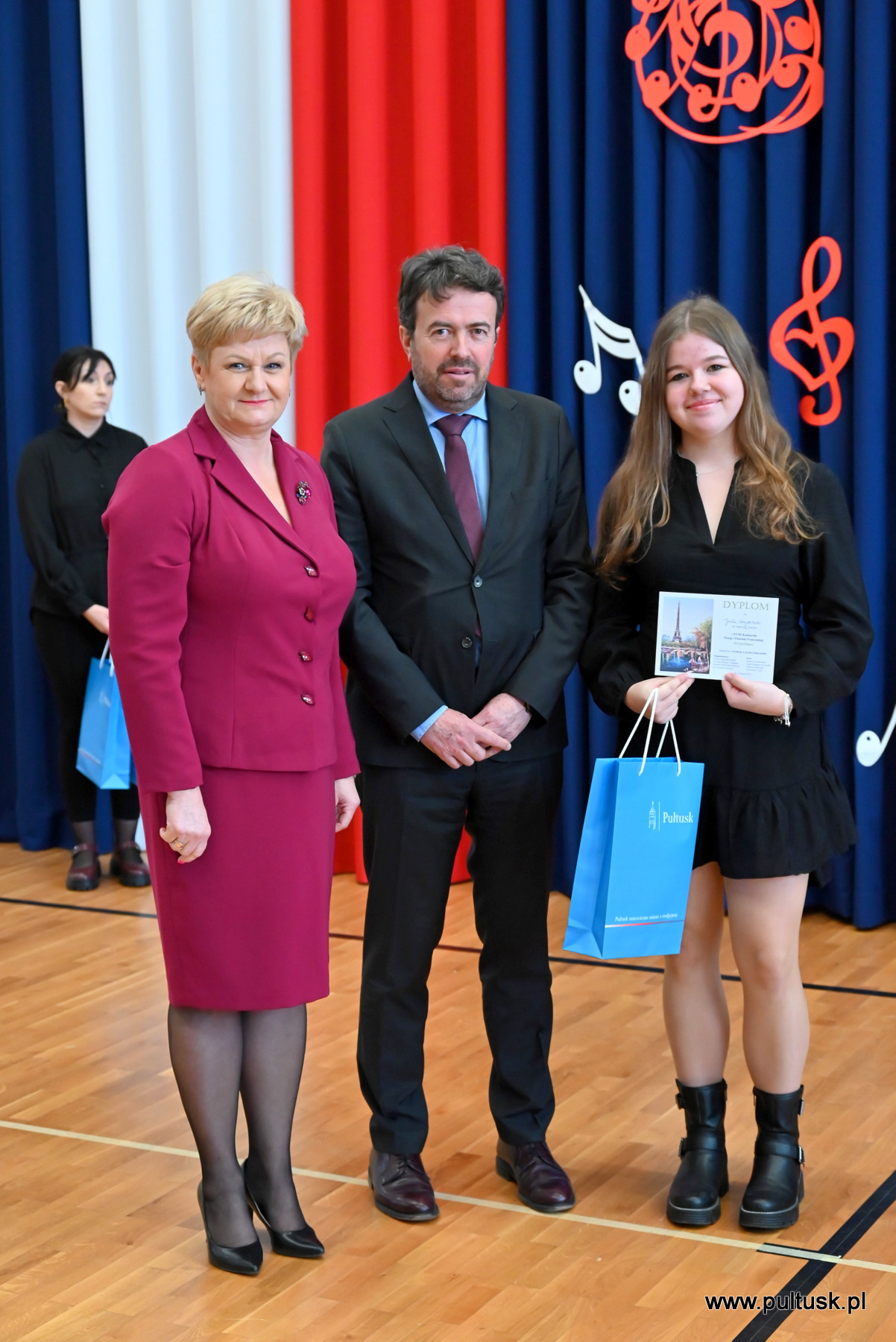 Nagrody wręczyli: Beata Jóźwiak Burmistrz Miasta Pułtusk oraz Philippe Morriset, Attaché do spraw współpracy edukacyjnej.