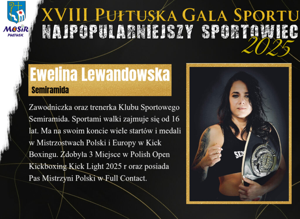 Zawodniczka oraz trenerka Klubu Sportowego Semiramida. Sportami walki zajmuje się od 16 lat. Ma na swoim koncie wiele startów i medali w Mistrzostwach Polski i Europy w Kick Boxingu. Zdobyła 3 Miejsce w Polish Open Kickboxing Kick Light 2025 r oraz posiada Pas Mistrzyni Polski w Full Contact.