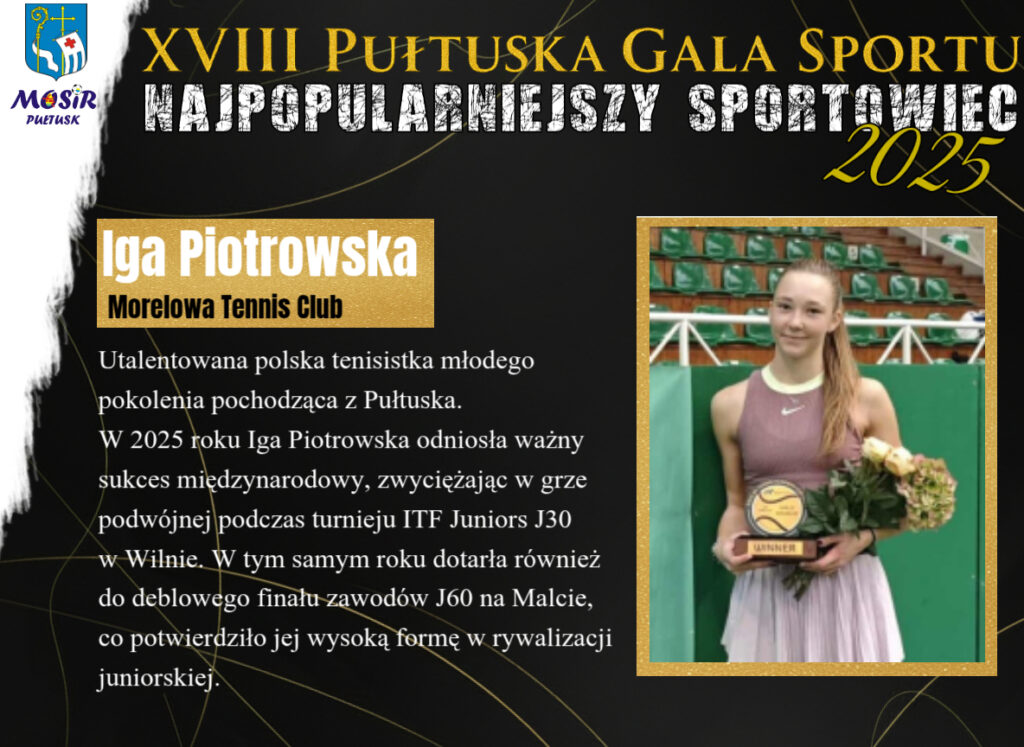 Utalentowana polska tenisistka młodego pokolenia pochodząca z Pułtuska. W 2025 roku Iga Piotrowska odniosła ważny sukces międzynarodowy, zwyciężając w grze podwójnej podczas turnieju ITF Juniors J30 w Wilnie. W tym samym roku dotarła również do deblowego finału zawodów J60 na Malcie, co potwierdziło jej wysoką formę w rywalizacji juniorskiej.