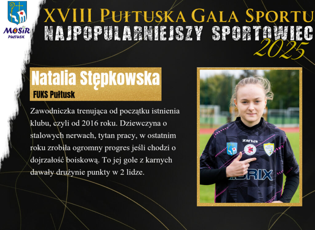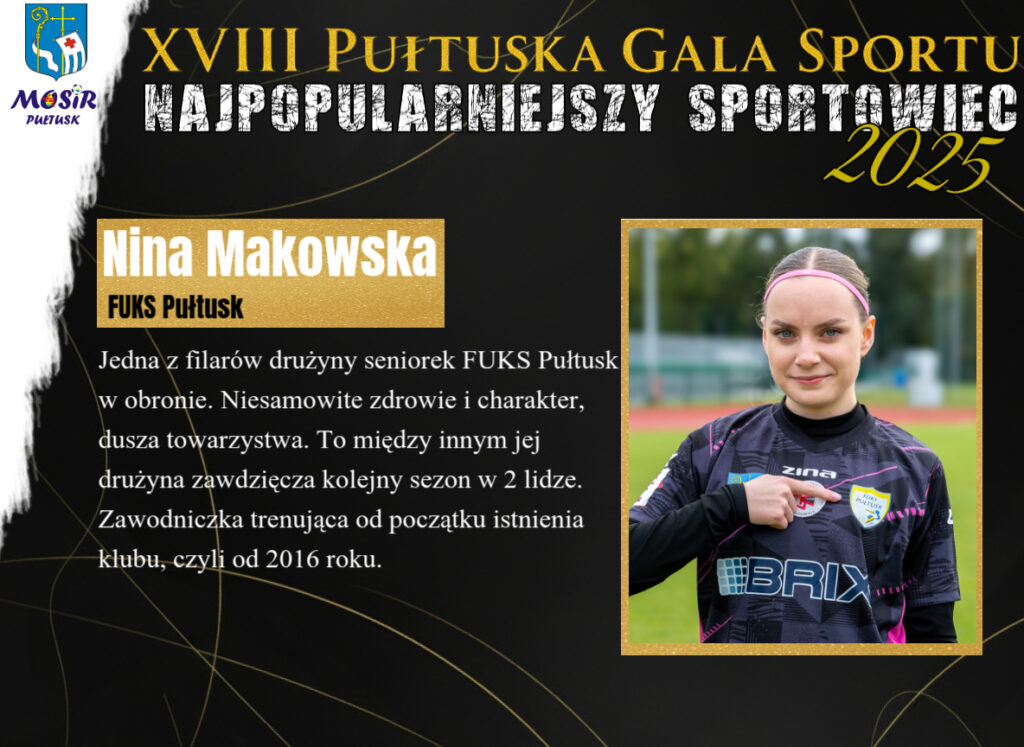 Jedna z filarów drużyny seniorek FUKS Pułtusk w obronie. Niesamowite zdrowie i charakter, dusza towarzystwa. To między innymi jej drużyna zawdzięcza kolejny sezon w 2 lidze. Zawodniczka trenuje od początku istnienia klubu, czyli od 2016 roku.