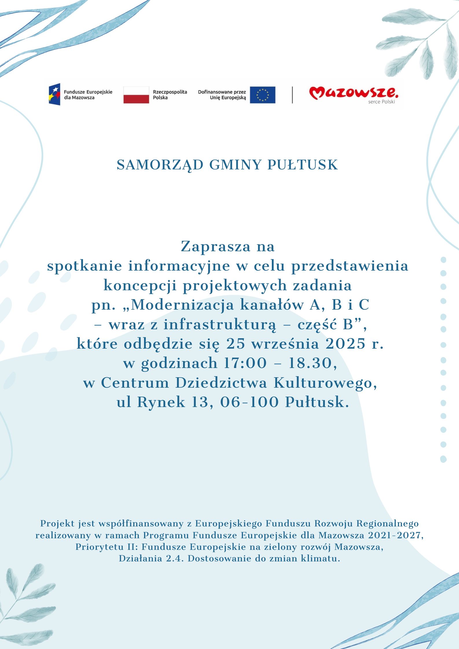 SAMORZĄD GMINY PUŁTUSK oraz SAMORZĄD POWIATU PUŁTUSKIEGO serdecznie zapraszają mieszkańców na spotkanie informacyjne dotyczące: przedstawienia koncepcji projektowych zadania pn. „Modernizacja kanałów A, B i C – wraz z infrastrukturą – część B”