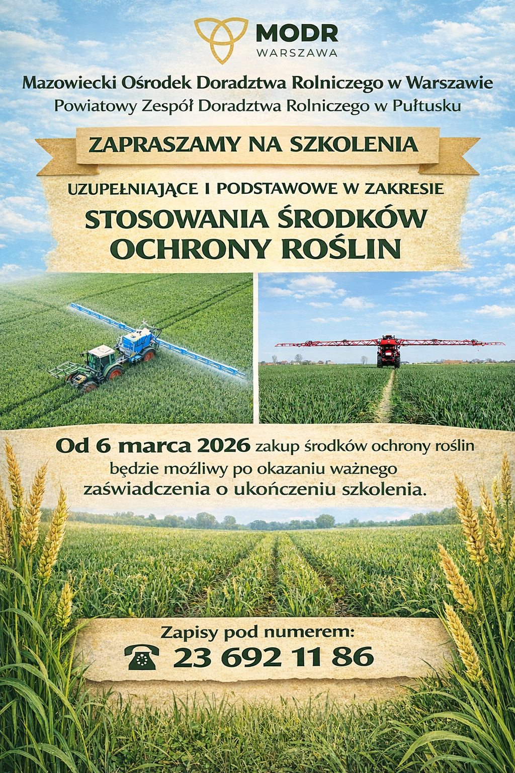 Informujemy, że od 6 marca 2026 r. zakup środków ochrony roślin będzie możliwy wyłącznie po okazaniu ważnego zaświadczenia o ukończeniu szkolenia.