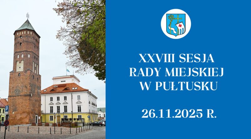 Uprzejmie informuję, że zwołuję XXVIII sesję Rady Miejskiej w Pułtusku 26 listopada 2025 r. (środa) o godz. 14.00. Sesja odbędzie się w Urzędzie Miejskim w Pułtusku – Sala Rady.