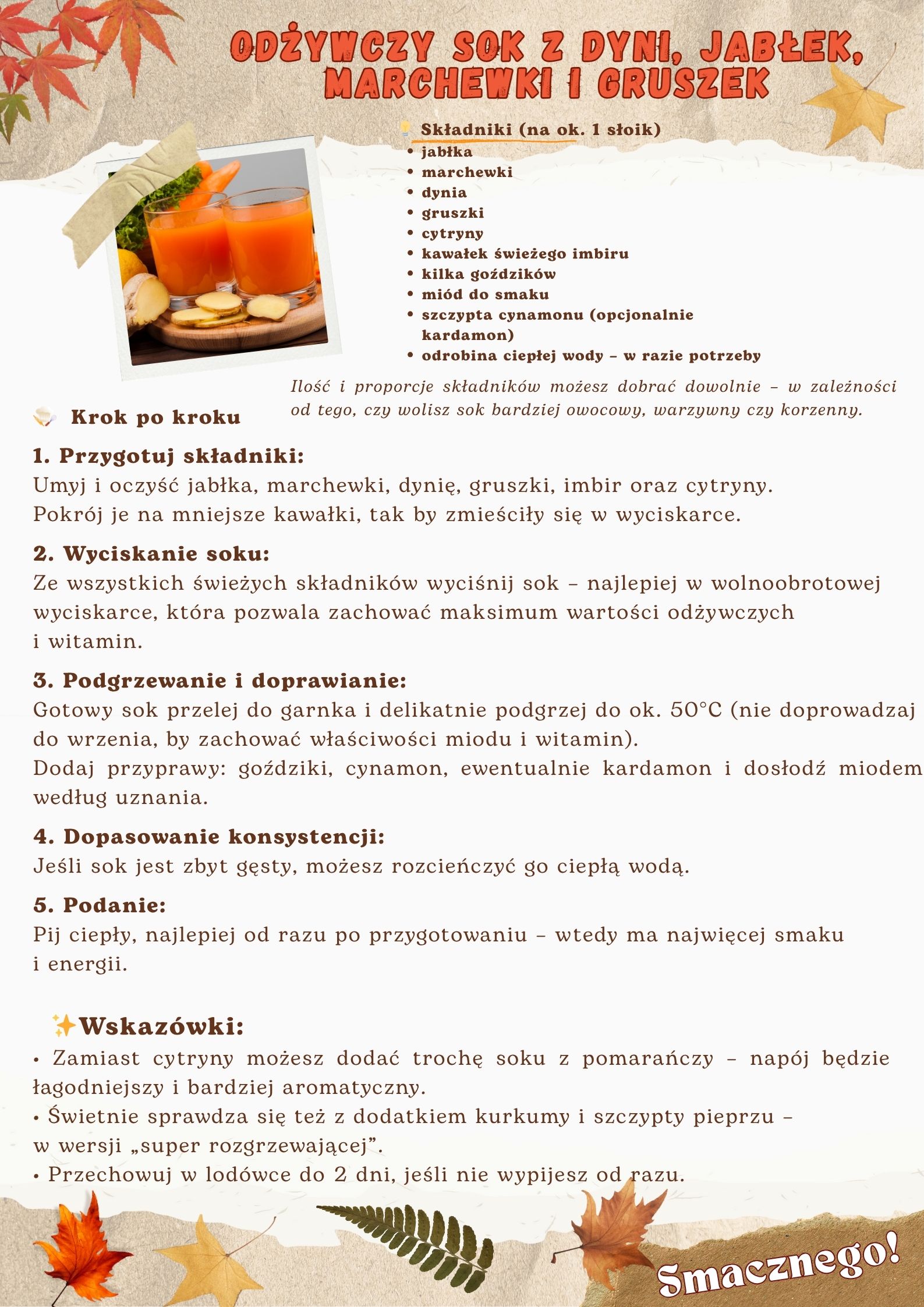 Odżywczy sok z dyni, jabłek, marchewki i gruszek